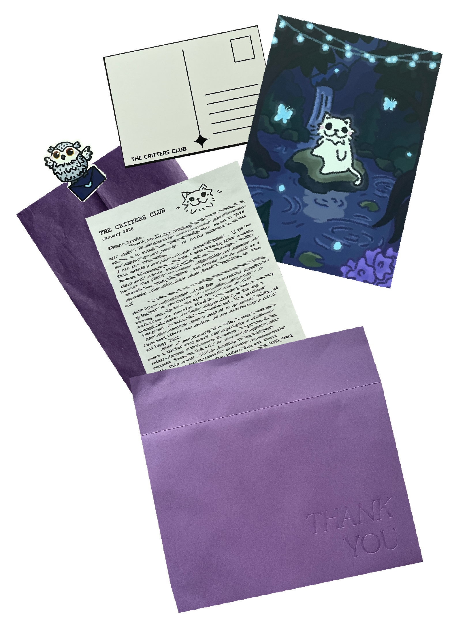 A snail mail club is a fun subscription where you receive themed envelopes filled with art prints, stickers, notes, and other creative surprises. Each mailing is designed to feel personal, artistic, and fun; like a little bundle of inspiration. Our aim is to deliver a touch of whimsy and a spark of happiness to your mailbox each month. Sign up now to experience the joy in every envelope! ⋆˚꩜。